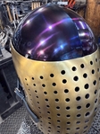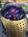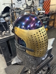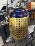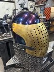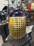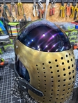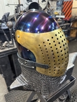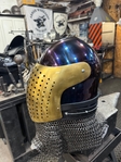 Armor helmet “chameleon sieve”The helmet is made of high-quality steel 30 hgsa, hardened, the visor is made of brass mesh with excellent visibility and good ventilation, the dome of the helmet is chameleon with the help of metal heating, aventail with blackening! The helmet is designed for full-contact medieval fencing and the buhurt is also good for dueling!Equipped with a sports orthopedic helmet, side and rear hardened steel protective plate!Durable, comfortable and reliable helmet, stylish and attractive!