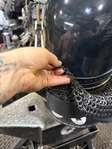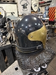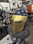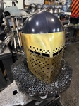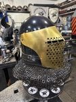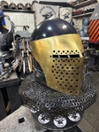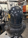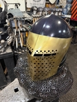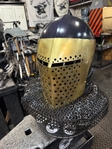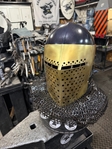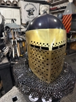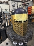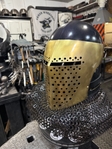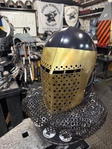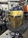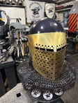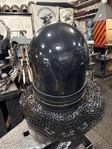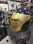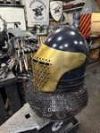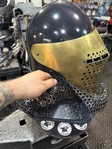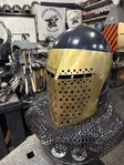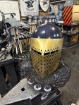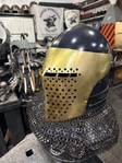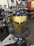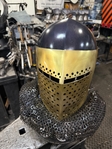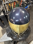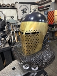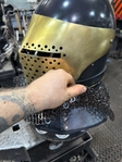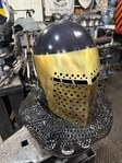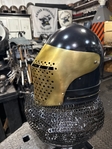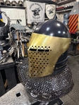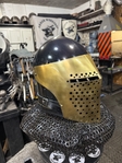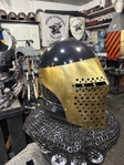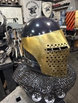 Armor helmet “spolettos black-brass”Our popular helmet with an updated brass visor and blued dome!Production from high-quality hardened steel 30 hgsa 3/2 mm.Settings for full-contact medieval combat, fencing, buhurt and duels!Stylish and reliable helmet, easy to use!Complete with everything necessary.Orthopedic lining, aventail, protective plates, Simon sling, double chin fixation system.Weight 6,6 kg.
